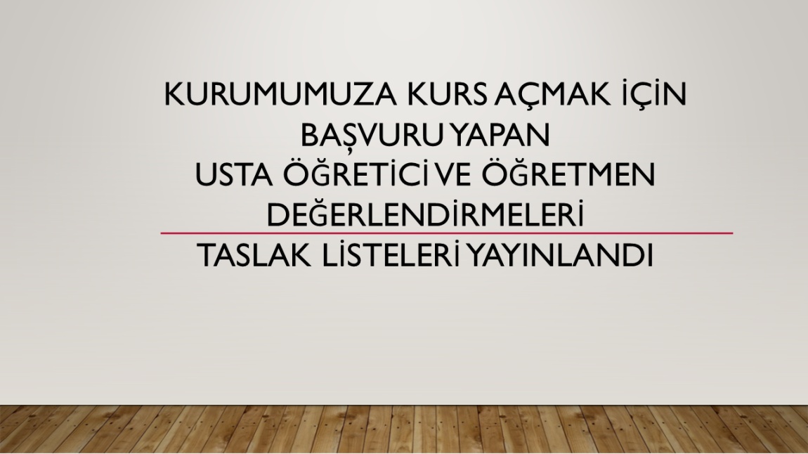 Kurs açmak için kurumumuza başvuru yapan usta öğretici ve öğretmen değerlendirme sonuçları taslak listelerine aşağıdan ulaşabilirsiniz.