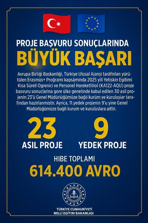 Avrupa Birliği Baskanliği, Türkiye Ulusal Ajansi tarafindan yürütülen Erasmüs+ Proğrami kapsaminda 2025 yili Yetiskin Egitimi Kisa Süreli Ogrenici ve Personel Hareketliliği (KA122-AQU) proje basvuru sonuclarina göre ülke genelinde kabul edilen 30 asil projenin 23'ü Genel Müdüriüğümüze bağlı kurüm ye kuruluşiar tarafindan hazirlanmistir. Ayrica, 11.yedek projenin 9'u yine Genel Müdürlüğümüze ( Hayat Boyu Öğrenme Genel Müdürlüğü ) bağli kurum ve kuruluşlara aittir.